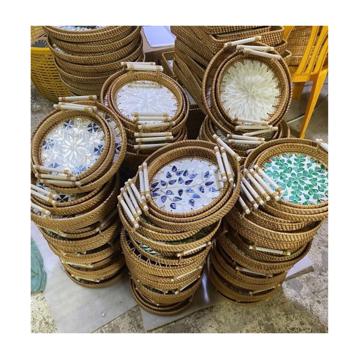 Attractive Design Wholesale Price Mother of Pearl Rattan Tray Round Shaped With MOP Handcrafted Rattan Wicker Handmade Trays