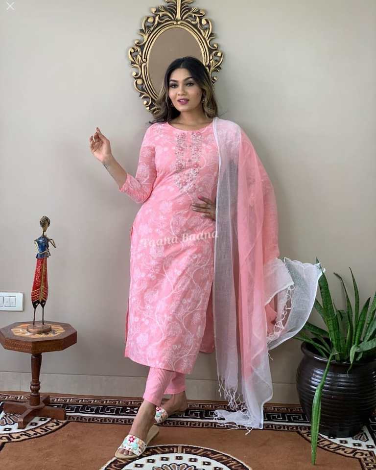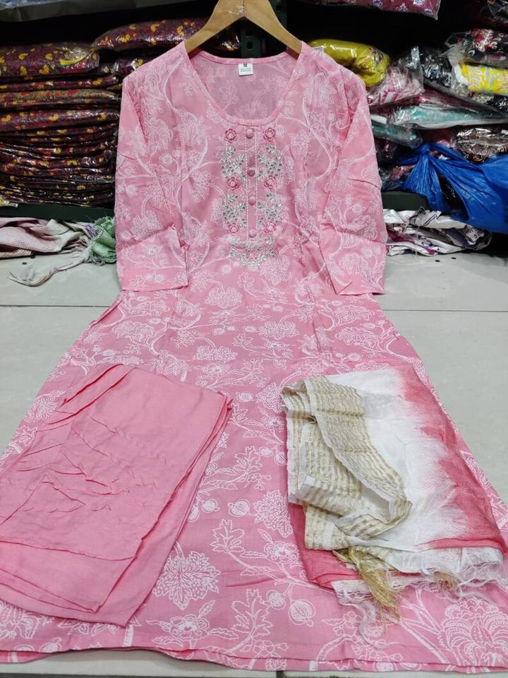 Kurti rose de travail brodé en rayonne lourde attrayante avec pantalon et ensemble Dupatta pour femmes, vêtements de fête, robes de mariée indiennes