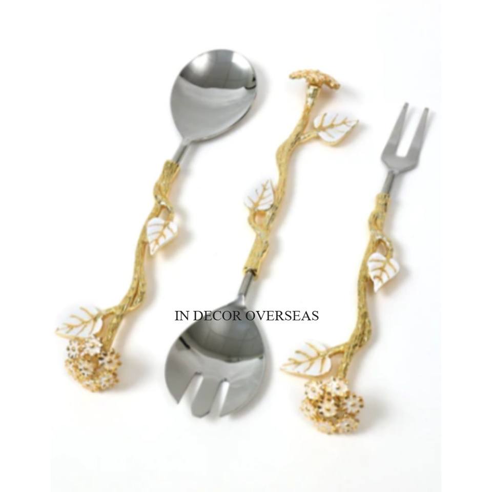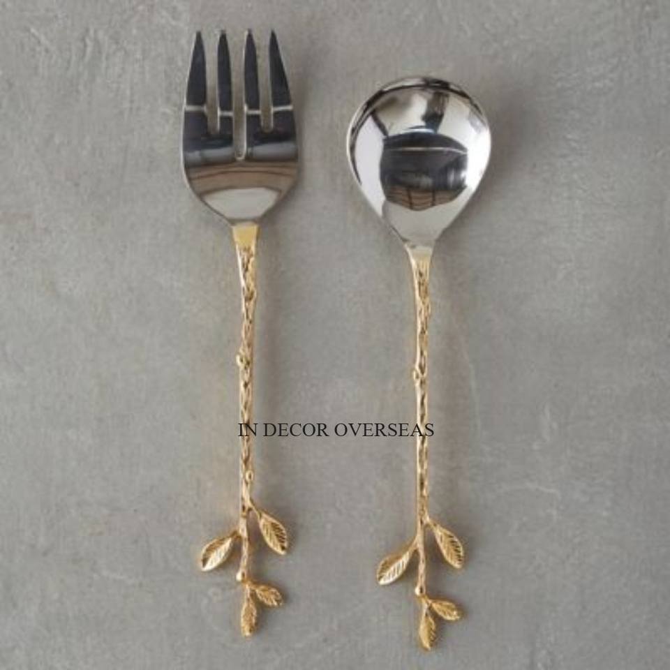 Look attrayant de haute qualité plaqué or feuilles poignée de concepteur pour argent brillant poli cuillère en acier inoxydable et ensemble de couverts folkloriques
