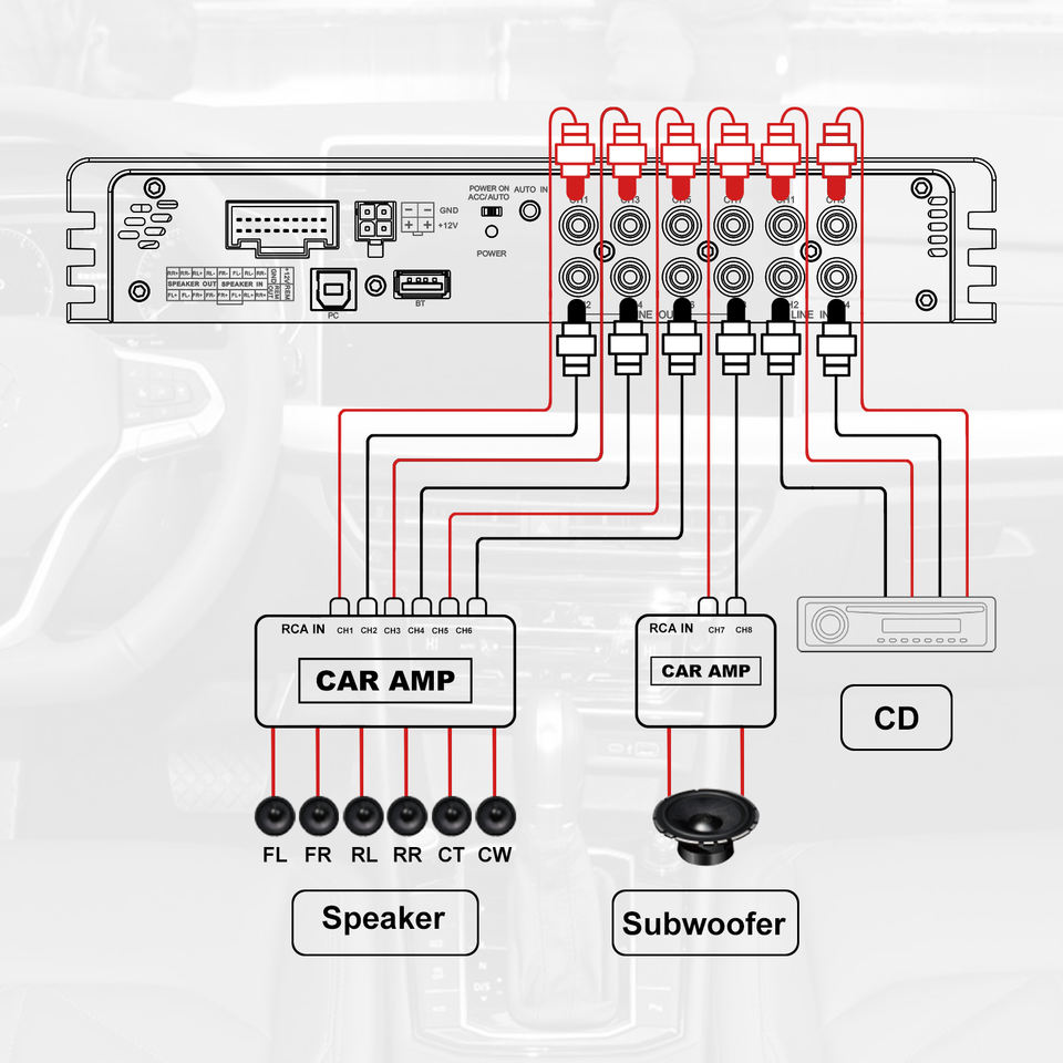 Entrée:4 ch haut niveau/4 RCA/BT (externe)