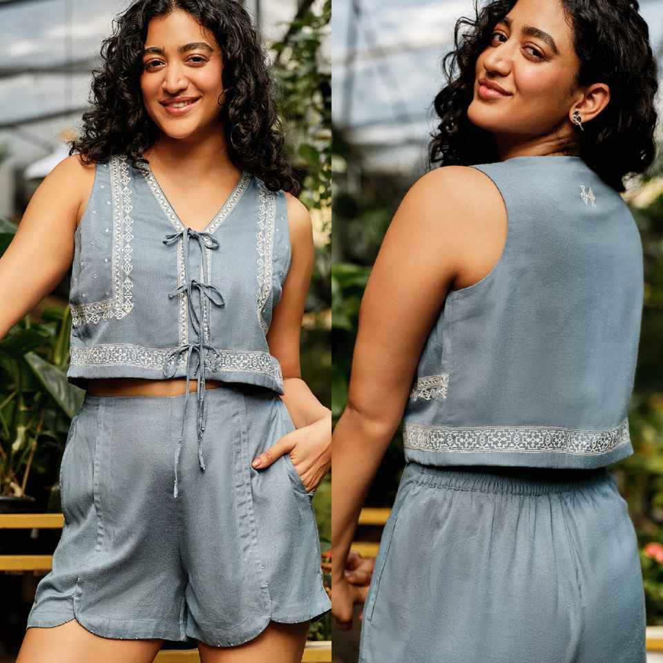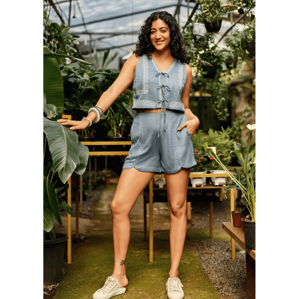 Ensemble coordonné brodé Aura Azure : Haut court à nouer Nomadic Slate et short festonné, duo artisanal en mélange de lin bleu
