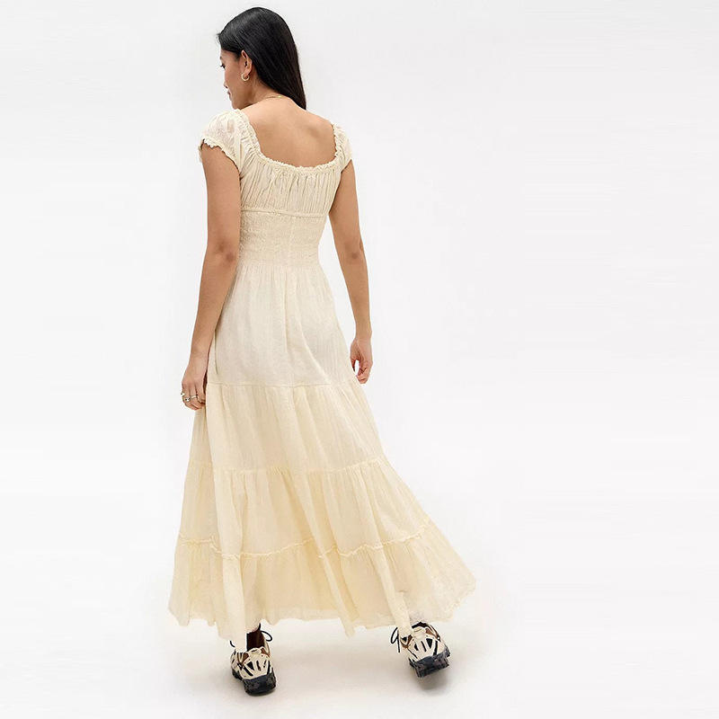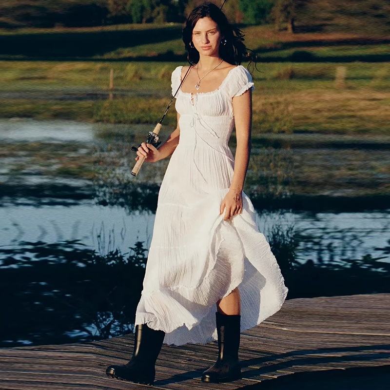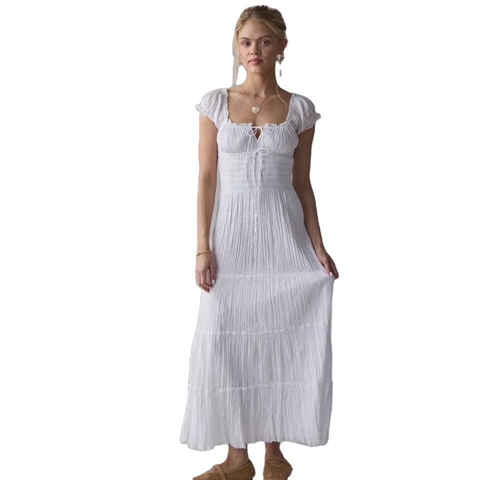 Robe midi australienne de style niche, blanche, douce, solide, respirante, à cordon de serrage, col carré, manches bouffantes, style A-line, style vacances à la française