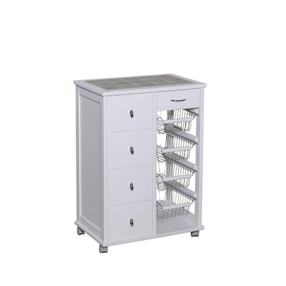 Chariot de rangement moderne MASLEGNO en bois de hêtre massif avec plateau en carrelage, roues en plastique et poignées en fer pour des espaces de vie organisés