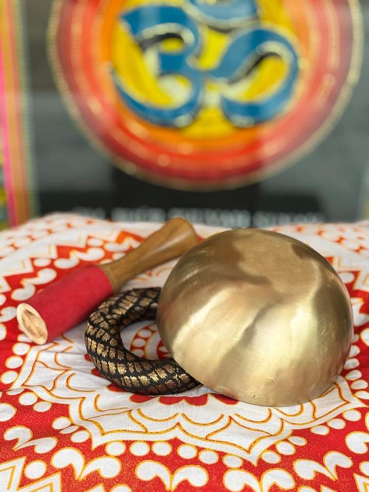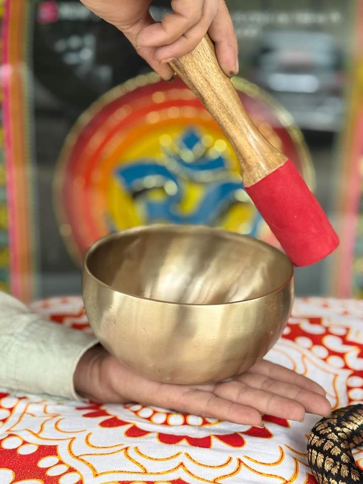 Bol sonore artisanal en laiton massif avec marteau en bois et coussin – Instrument de relaxation pour la méditation, la guérison des chakras et la thérapie sonore du yoga