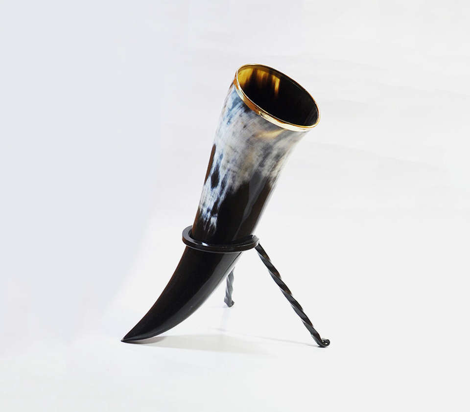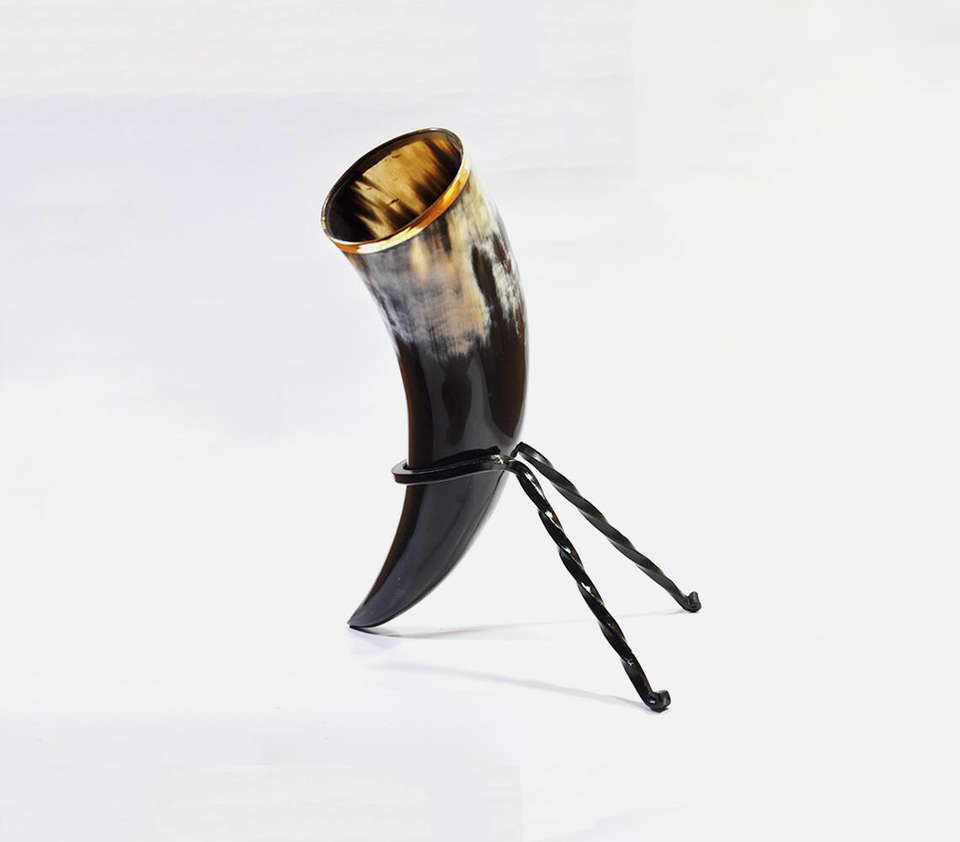 Authentic Handcrafted Viking Drinking Horn With Elegant Golden Brass Rim And Sturdy Wrought Iron Stand Traditional Polished