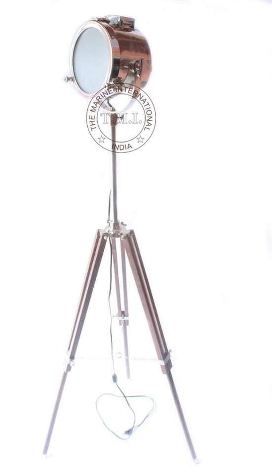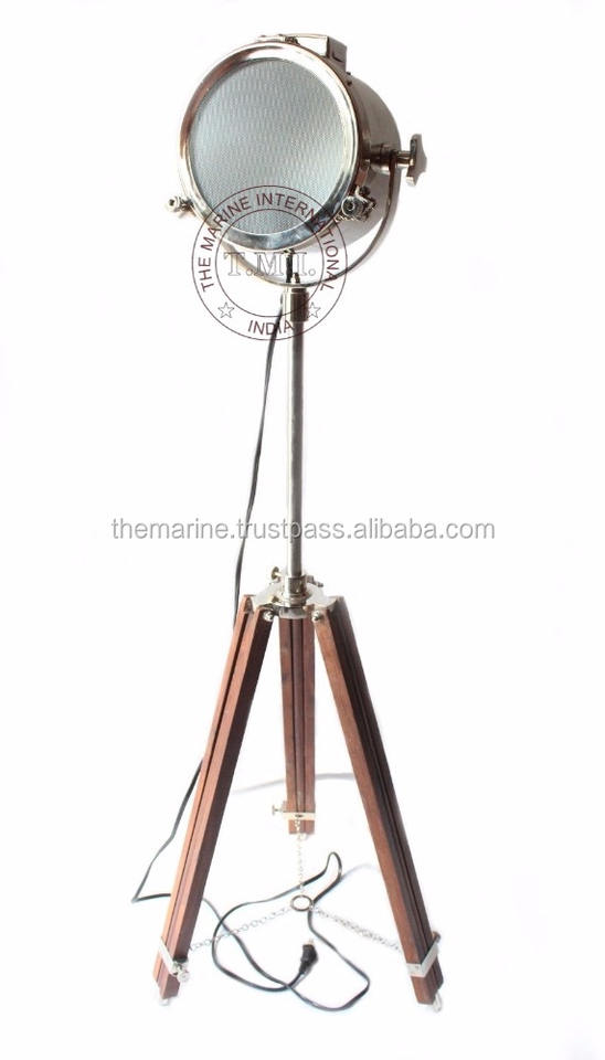 Projecteur de sol Look authentique avec trépied réglable, support de projecteur en Chrome nautique avec support en bois