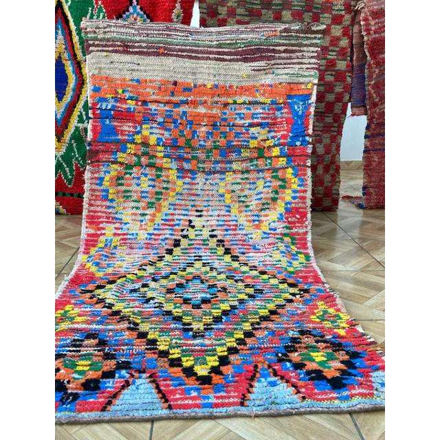 Tapis Boucherouite marocain authentique fait main, style bohème chic, coloré, vintage, artisanat Atlas, décoration.