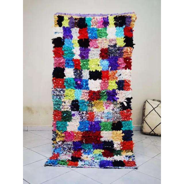 Tapis Boucherouite marocain authentique fait main, style bohème chic, coloré, vintage, artisanat Atlas, décoration.