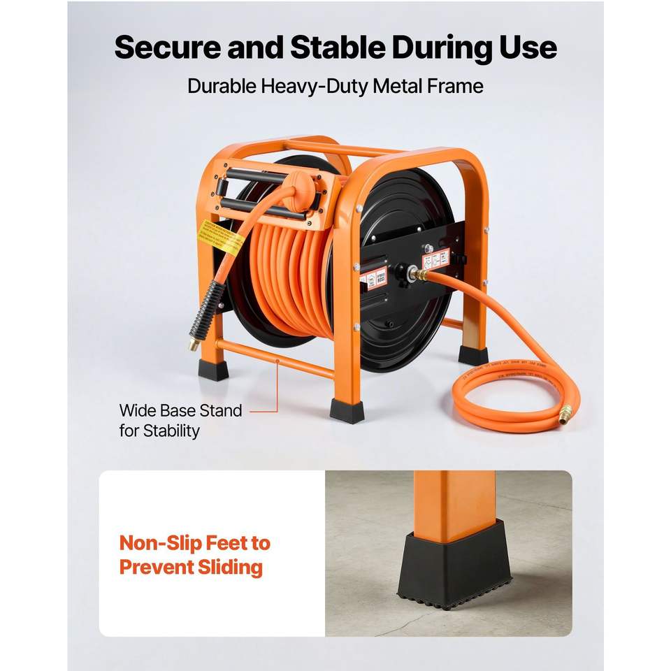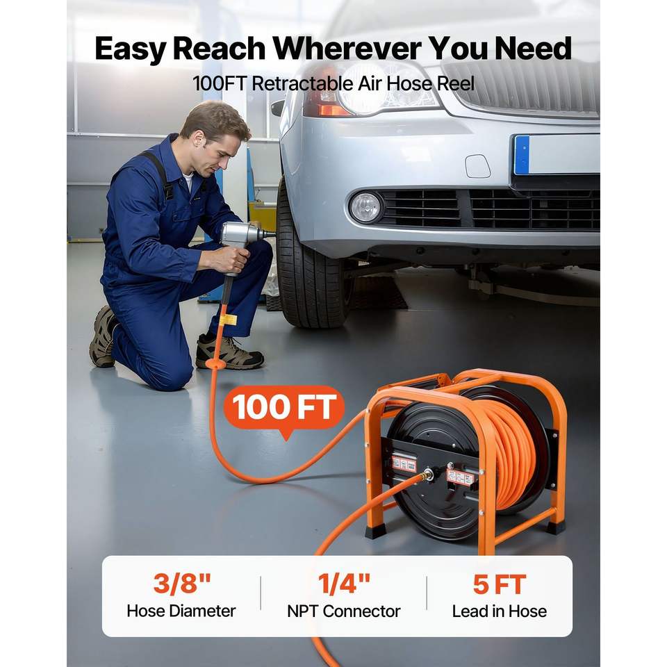 Enrouleur de tuyau d'air en PVC à rembobinage automatique 3/8 pouce x 100 pieds, pression max. 300 PSI, avec câble d'arrivée de 5 pieds et cliquet pour compresseur d'air