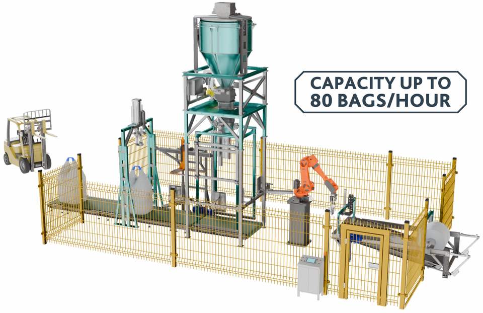 Ligne automatisée pour l'emballage en big-bags avec bras robotisé, 40-80 sacs par heure, système de remplissage et de palettisation automatisé