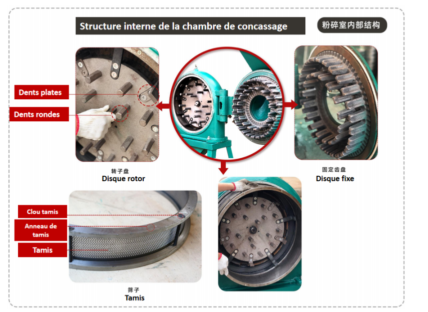 Moteur, ventilateur, sas d'air, Distributeur de farine, cadre en acier, Disques de meulage, dents de meulage et écransComposants de base