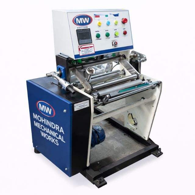 Machine à rembobiner la feuille d'aluminium semi-automatique (MOHINDRA MECHANICAL WORKS MMW-KFR001) pour la fabrication de rouleaux de feuille d'aluminium de qualité alimentaire