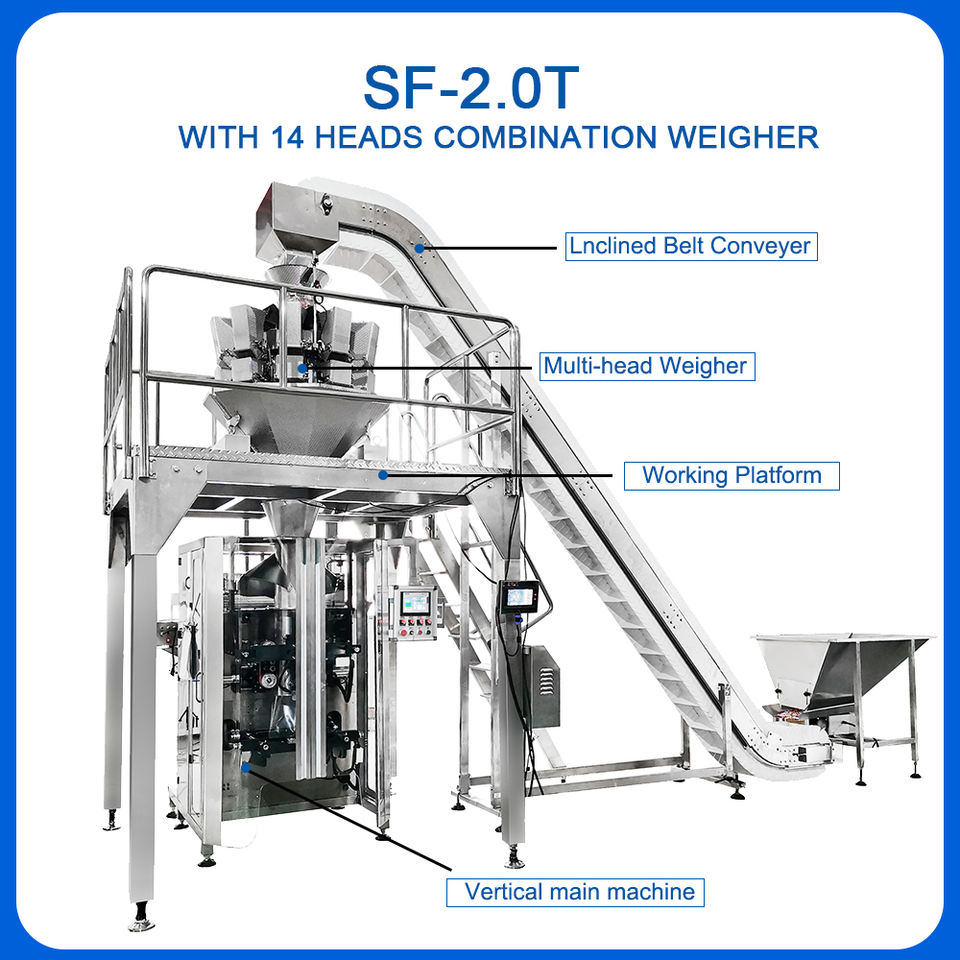 Système de machine:Peseur multitête, godet matériel, plate-forme de travail, convoyeur de sortie
