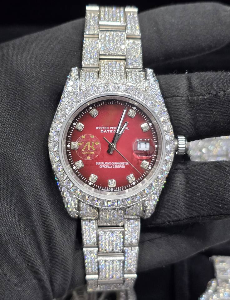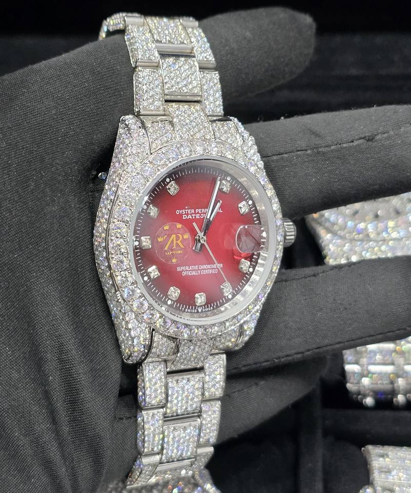 Montre-bracelet à quartz automatique de luxe, style Hip Hop classique, avec cadran rouge en acier entièrement pavé VVS, logo personnalisé, verre analogique serti de moissanite