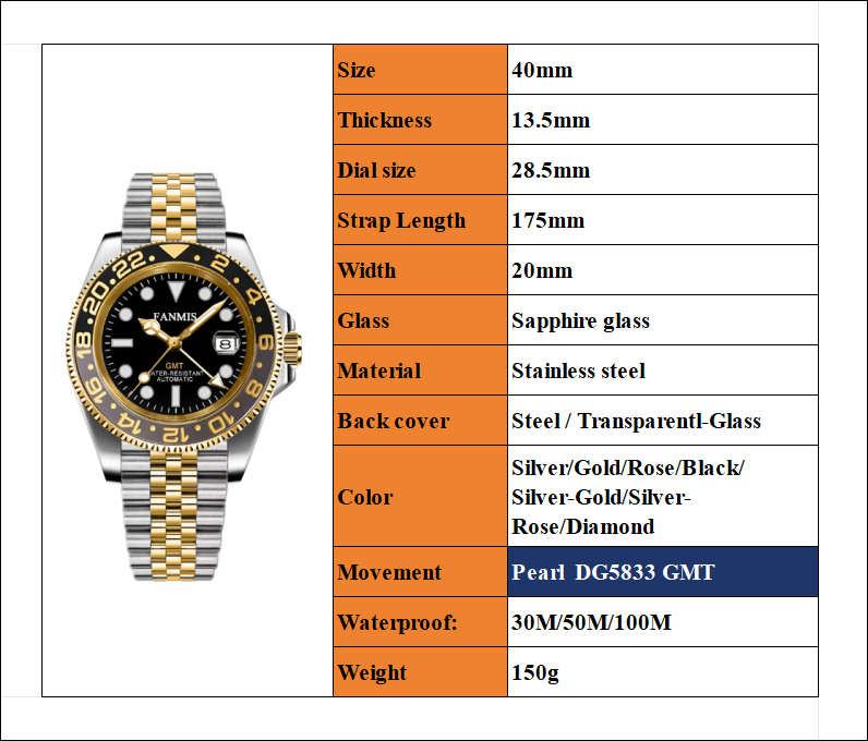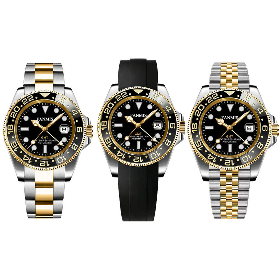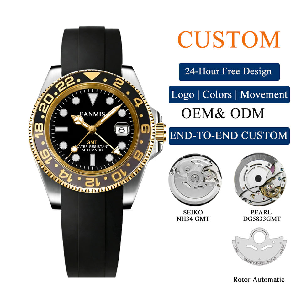 Montre automatique de luxe personnalisée avec étiquette privée, mécanique, perle DG5833 GMT, résistante aux chocs, pour homme, dorée