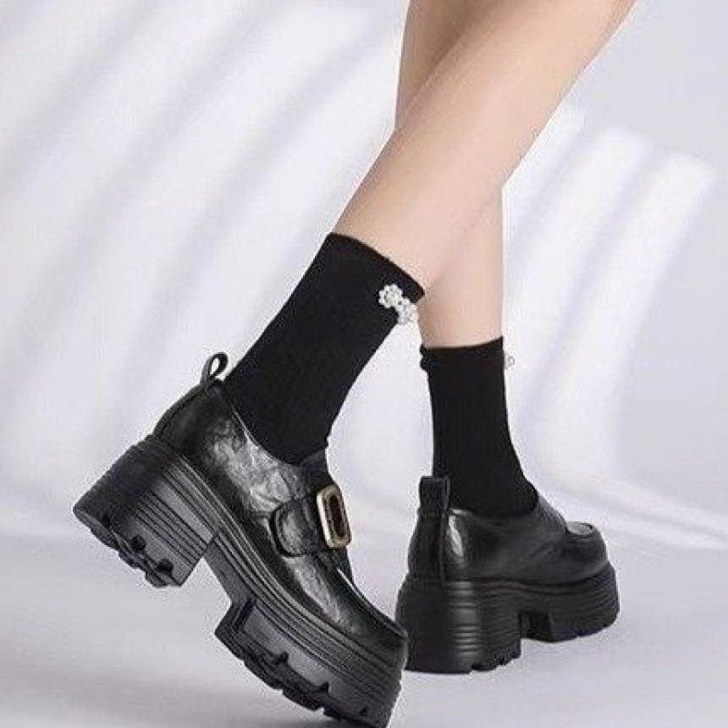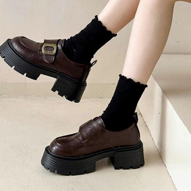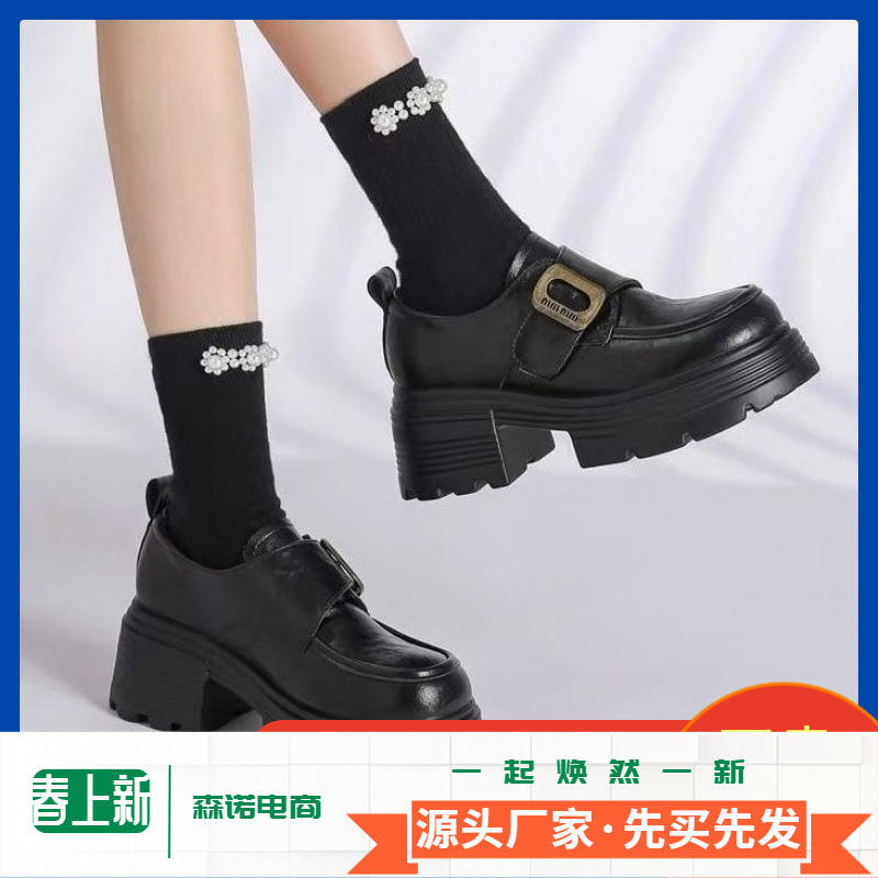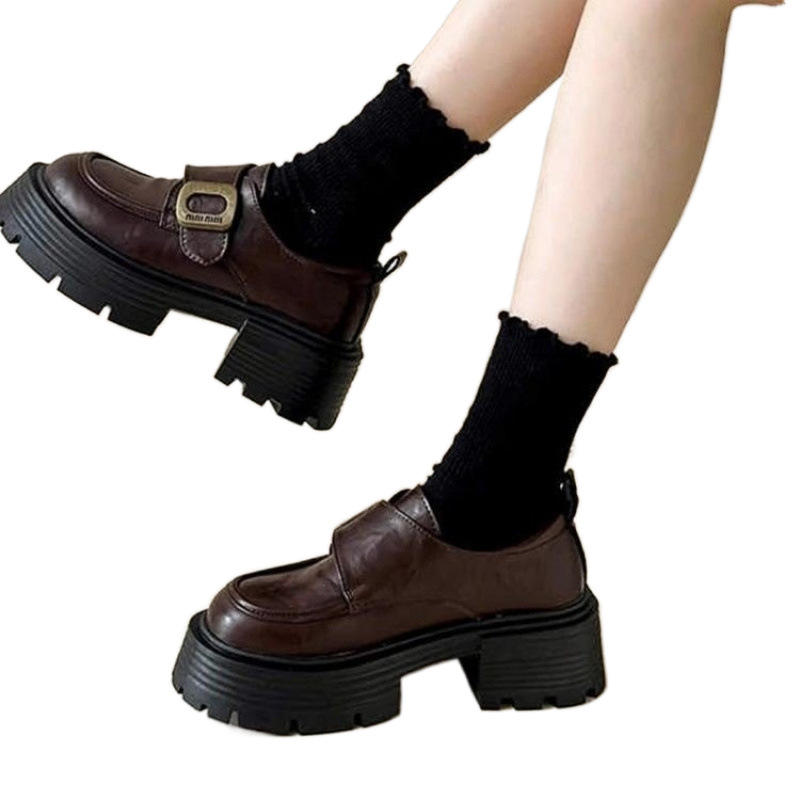 Automne Style britannique mocassins à semelles épaisses pour femmes en cuir véritable tout-match sabots Mules plate-forme d'amélioration de la hauteur noir petit