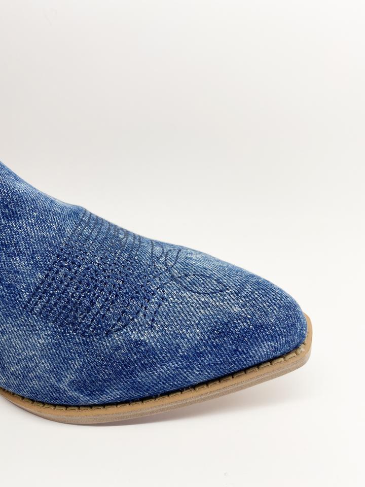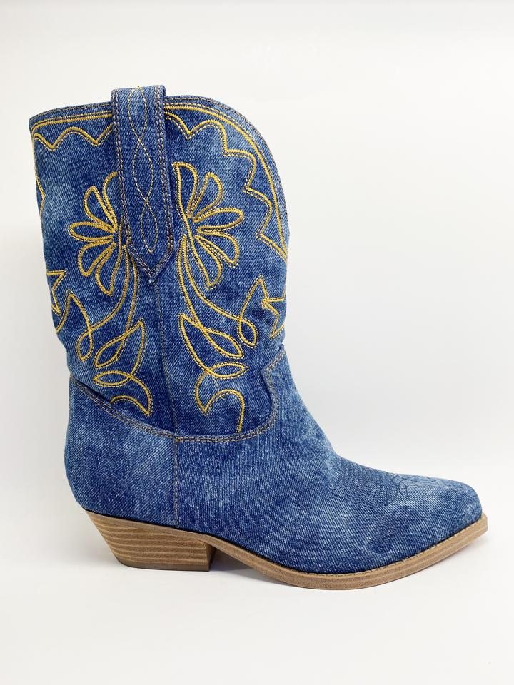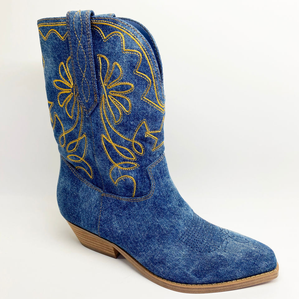 Bottes de cow-boy mi-mollet de style classique d'automne avec broderie fine talon carré à enfiler Denim fermeture à bouton à bout pointu supérieur