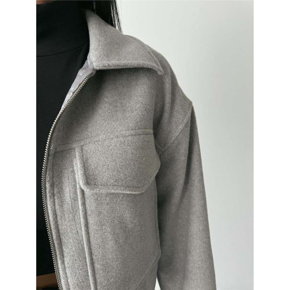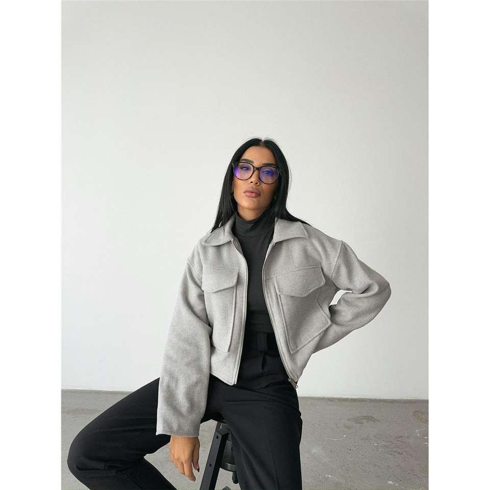 Blouson court réversible en cachemire gris automne avec capuche, fermeture éclair, franges, sequins, appliqués et décorations de plumes, style bomber uni
