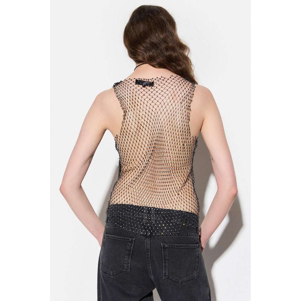 Autumn Spring Casual Shiny Stone Mesh Blouse Crew Neck Cap Sleeve 220g Size XL Regular Fit Boy Half Knitted Sequined Front