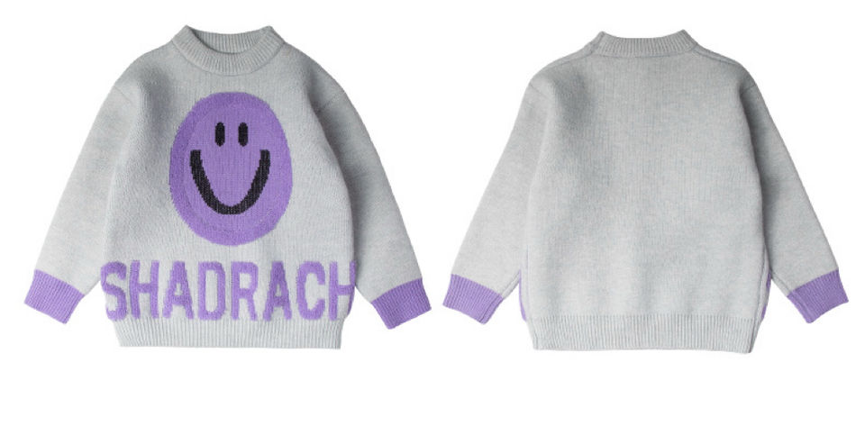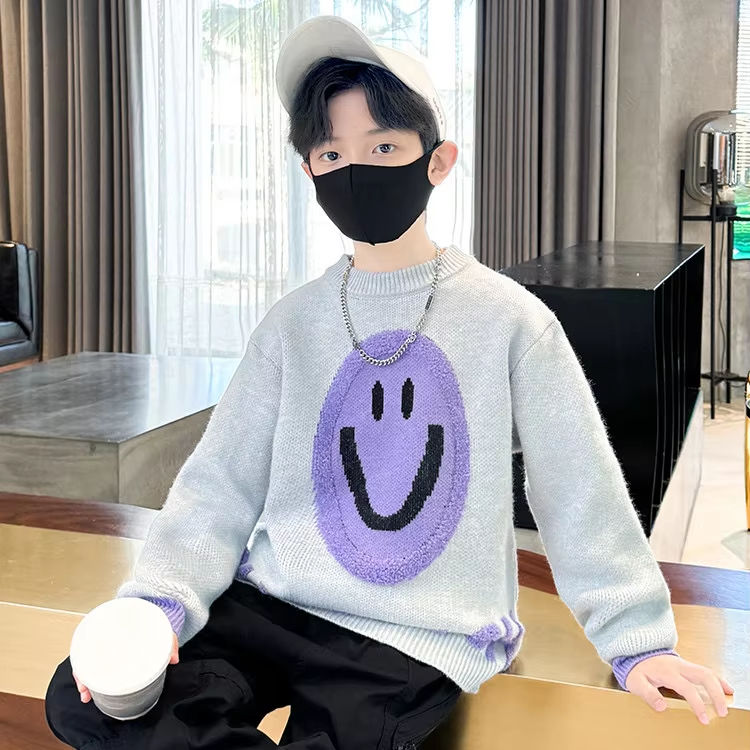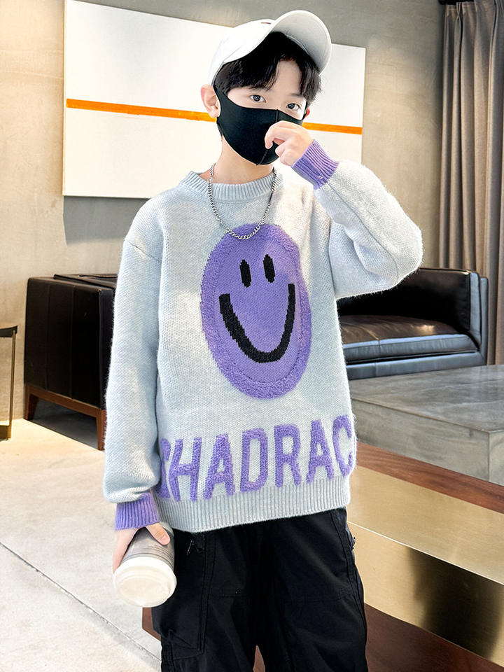 Automne printemps loisirs polyvalent col rond pull chaud garçons confortable élégant tricoté violet souriant visage motif gris blanc