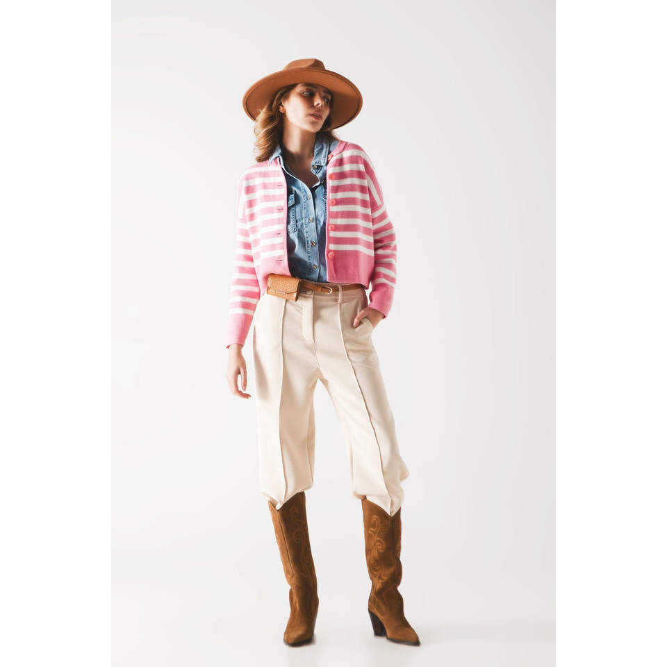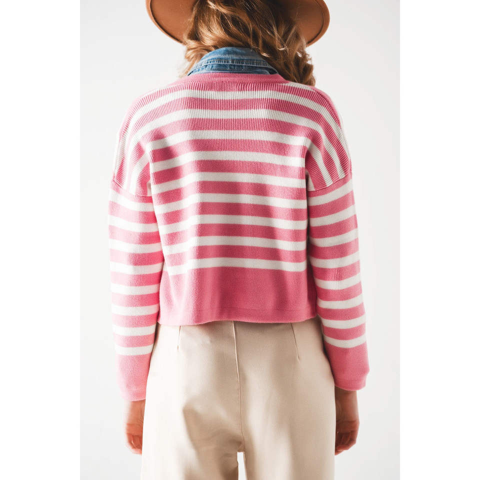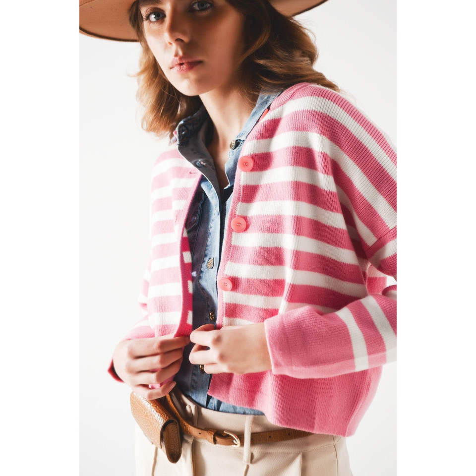 Cardigan léger à rayures roses avec broderie et boutons décoratifs pour l'automne et le printemps, vêtement long