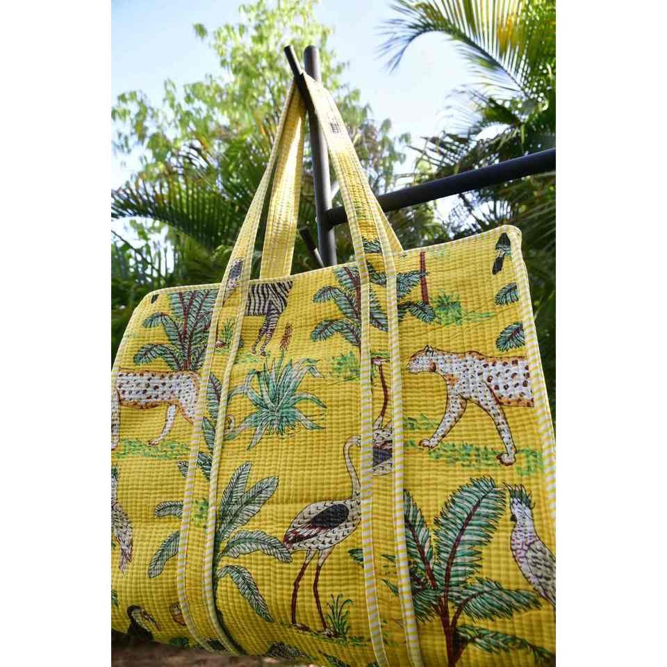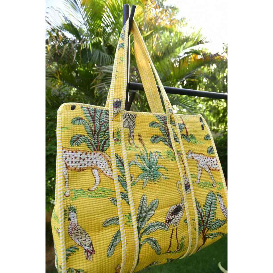 Sac fourre-tout portable jaune soleil à imprimé léopard, doublure en coton, style bohème, avec fermeture éclair, personnalisable avec logo, fabriqué à Jaipur