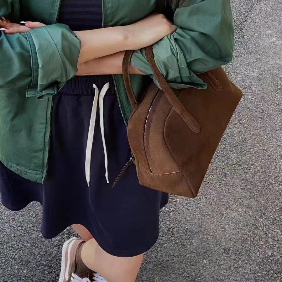 Autumn Winter Exclusive High-Grade Women's Handbag Niche Retro Simple Suede Bowling Bag Boston Design Genuine Leather Polyester