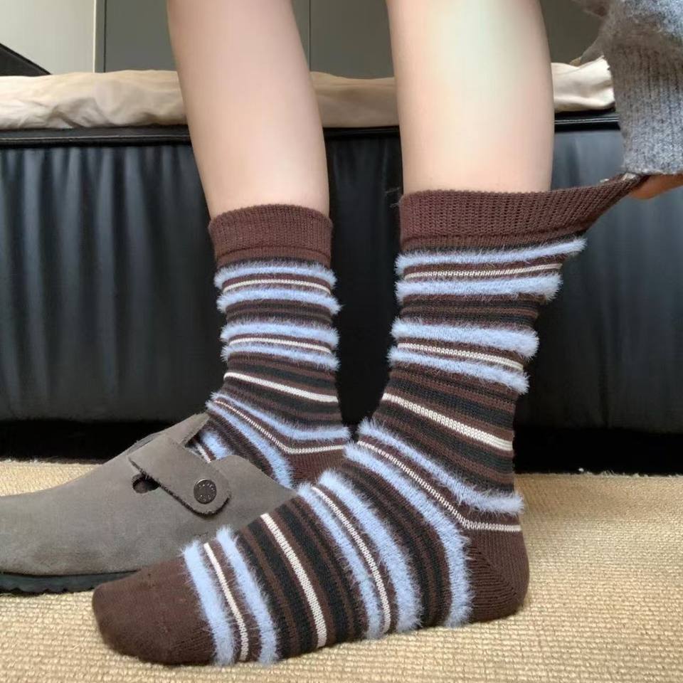 Automne hiver Style coréen mi-mollet rayé en peluche chaussettes pour femmes décontracté équipage chaussettes anti-dérapant chaud chaussettes polyvalent pour un usage quotidien