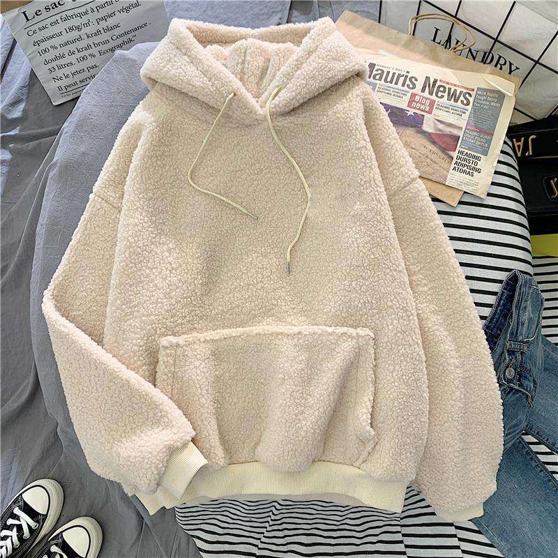 Autumn Winter New Arrival Women's Loose Long Sleeve Pullover Solid Blue Velvet Cashmere Hoodie Sweatshirt Thick Warm Coat Casual