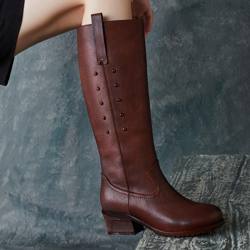 Nouvelles Bottes Hautes de Chevalier en Cuir de Vachette Style Britannique Automne-Hiver, Talon Chaton, Talon Épais Clouté, Imperméables et Isolantes, à Enfiler