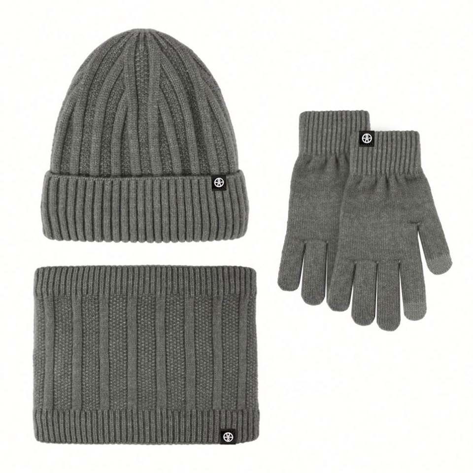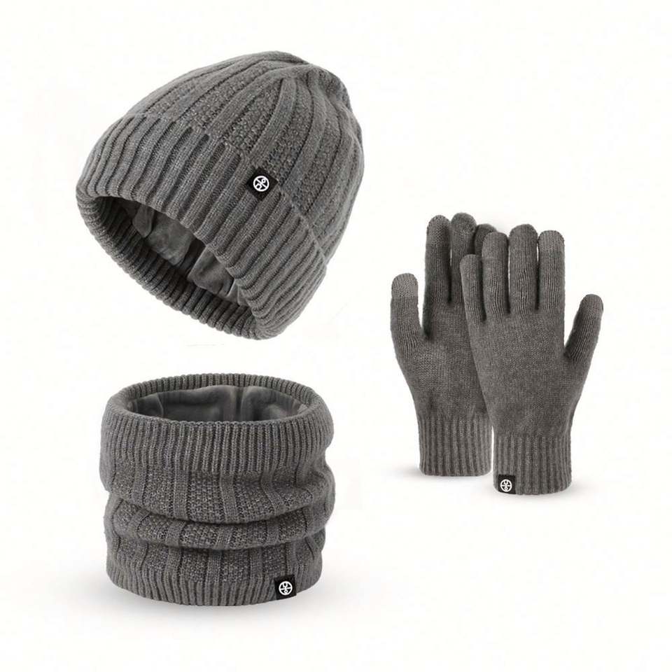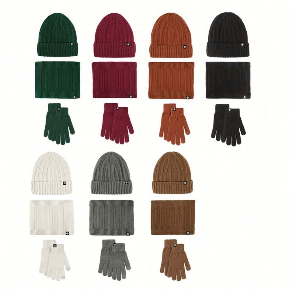 Ensemble trois pièces automne-hiver, bonnet en velours épais chaud avec broderie 3D, écharpe et gants pour les voyages en plein air