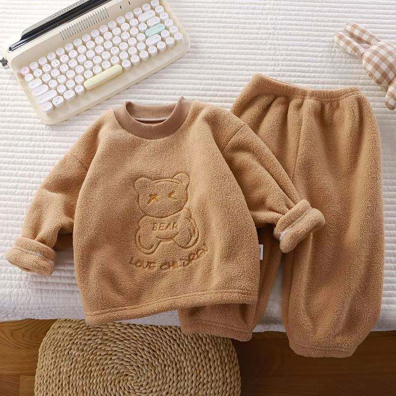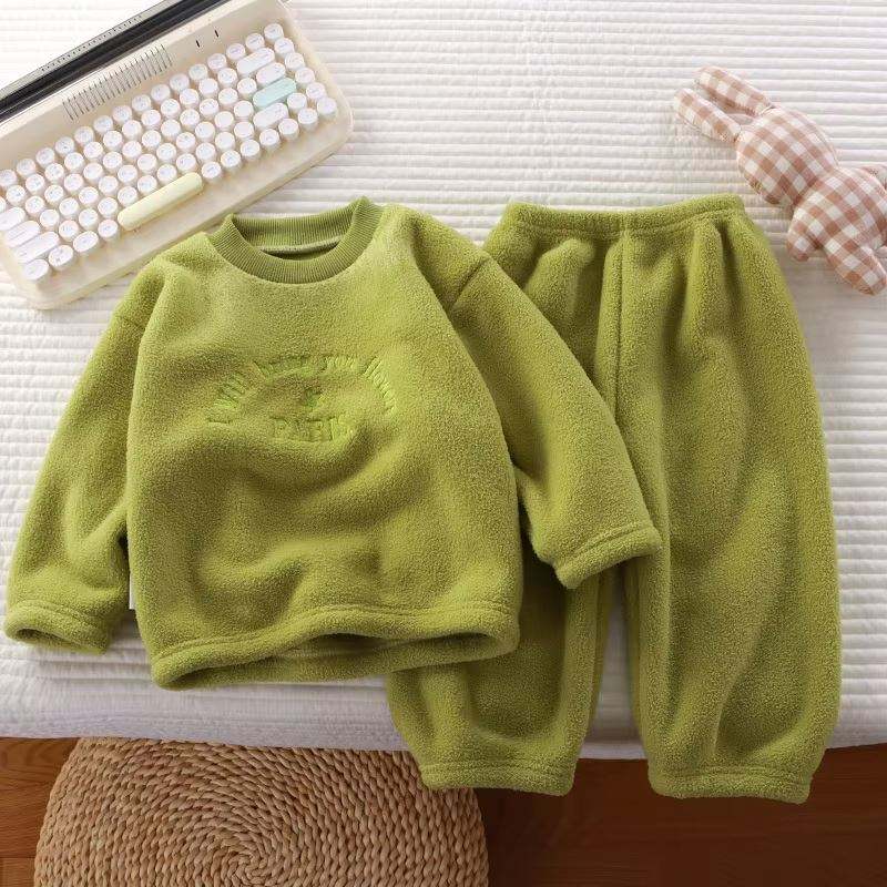 Autumn Winter Unisex 2PCS Pajamas Set Boys & Girls Soft Elastic Waist Pant Outfits Warm Fleece Thicken Sweatshirt Sizes