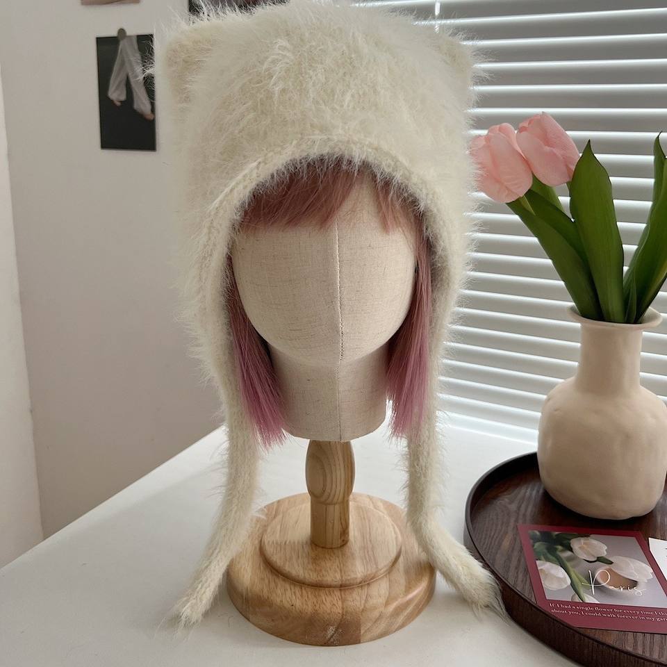 Chapeau d'ours Lei Feng en peluche mignon pour femme avec protection des oreilles chaude pour l'automne/hiver, cordon de serrage, fibres acryliques douces et cirées