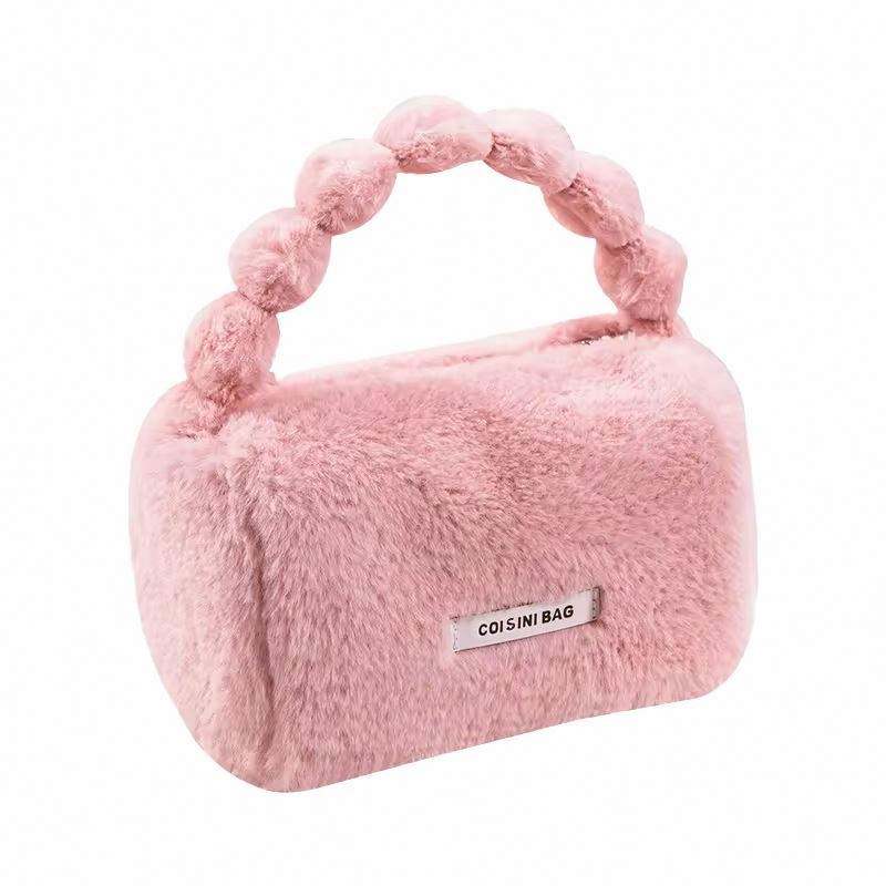 Sac fourre-tout portable en fausse fourrure de lapin imperméable rose bonbon avec fermeture éclair pour femme – Collection Automne/Hiver