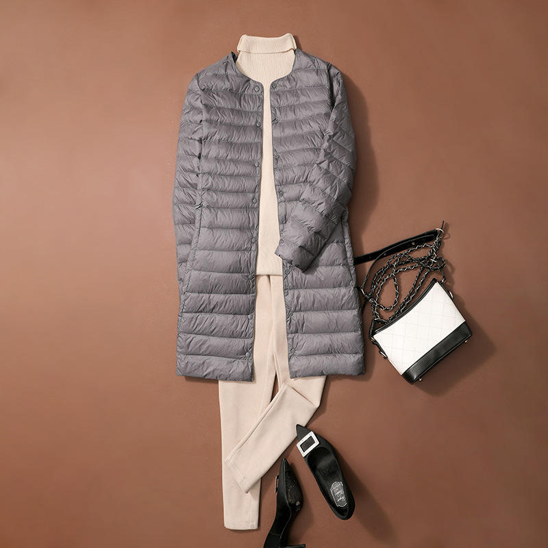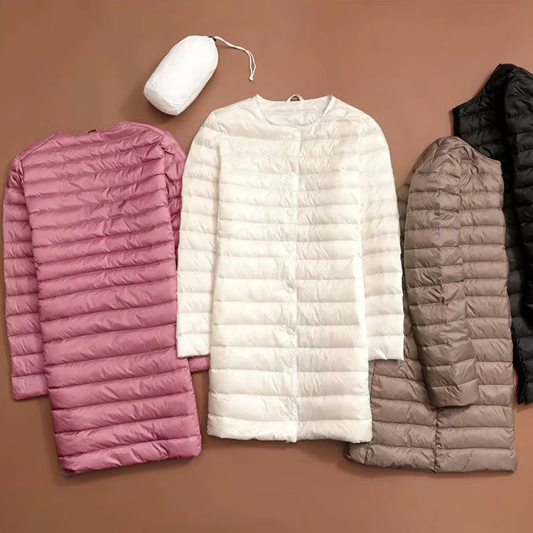 Veste longue à col rond d'automne et d'hiver avec doudoune mince sans col pour femme mi-longue
