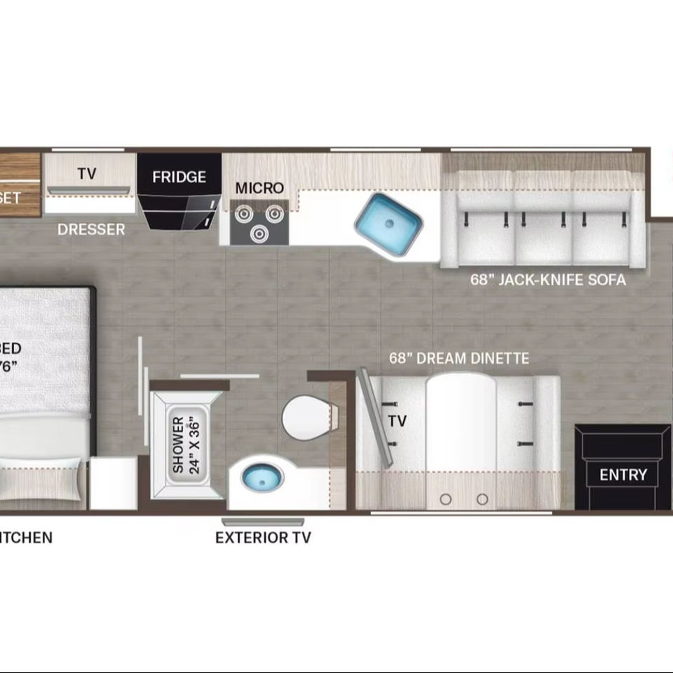 Lit, Cuisine, Salle de bains, stockage, Climatisation, Coin repas, Système de divertissement