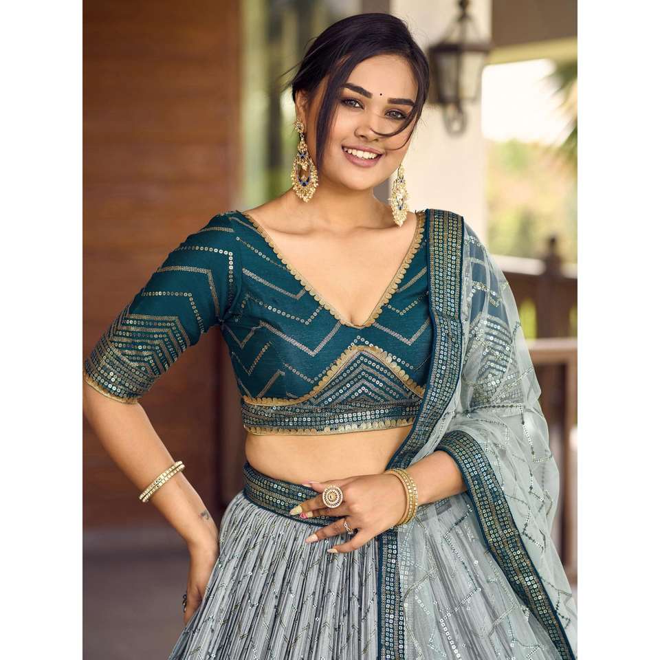 Awesome Teal Blue Sequins Chinon Sangeet Wear Lehenga Choli With Dupatta