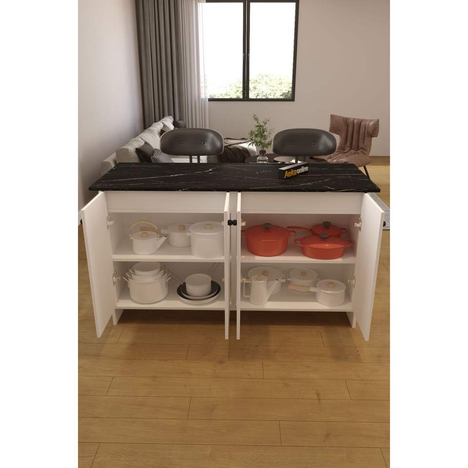 Îlot de cuisine moderne Ayder en chêne massif à 4 portes avec 7 étagères et compartiment caché, chariot de cuisine blanc