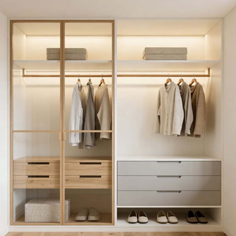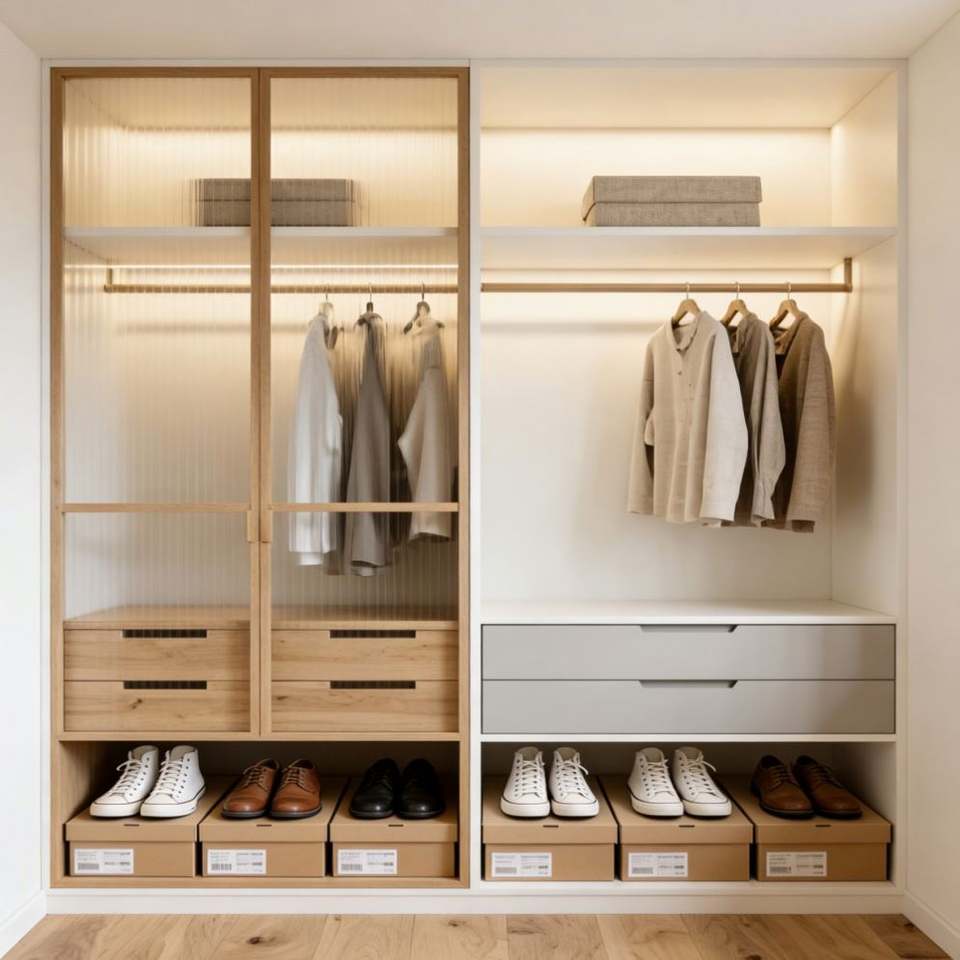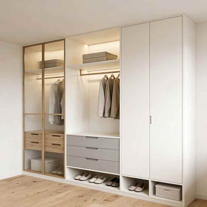 Armoire ouverte moderne BALOM 2026 | MDF blanc + verre dépoli | Armoire de chambre à coucher personnalisée avec rangement à chaussures et éclairage LED