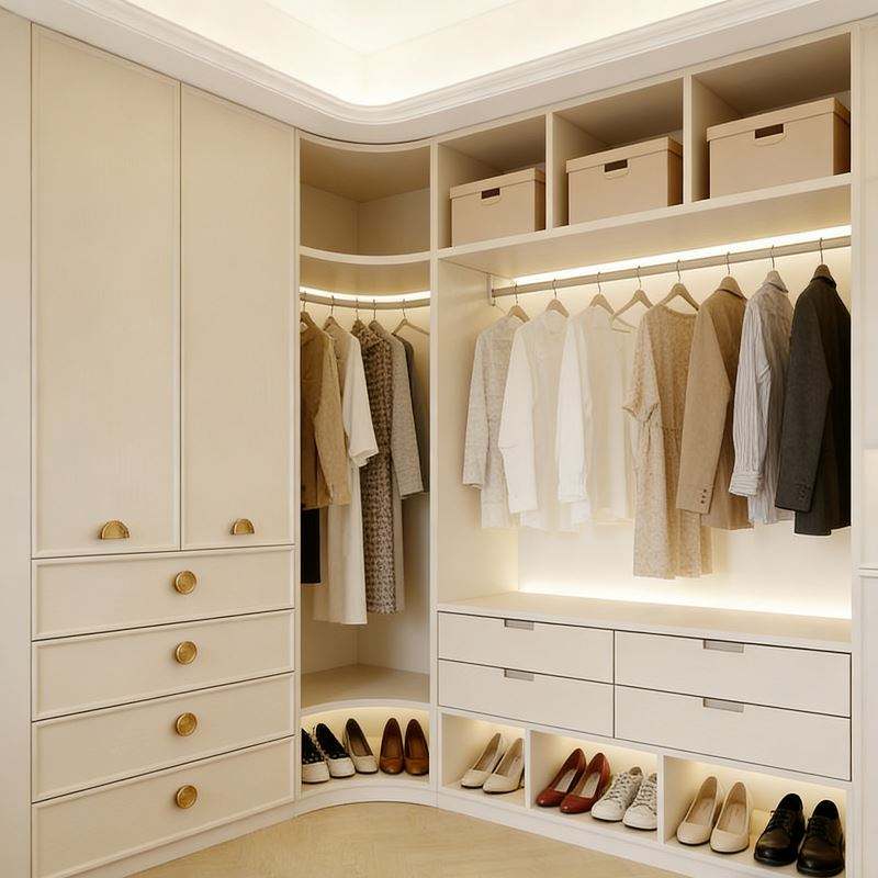 Armoire de rangement en forme de L de style crème BALOM, armoire d'angle avec tiroirs, zone de suspension, poignée dorée, meubles de chambre à coucher