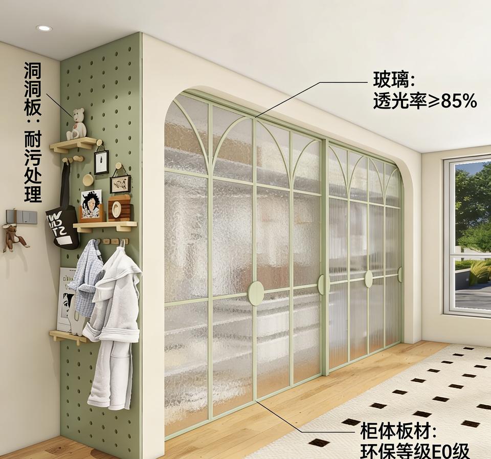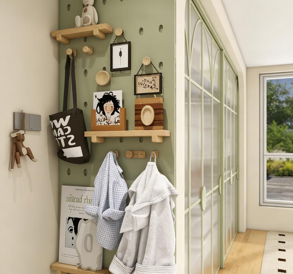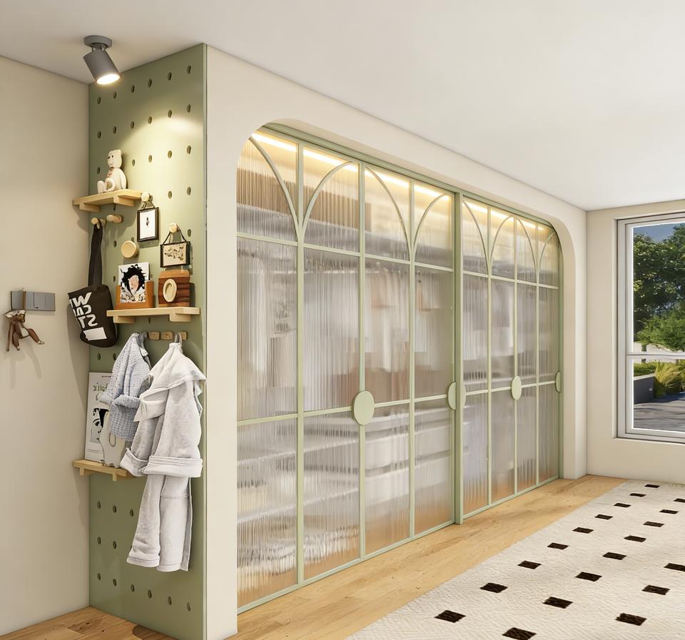 Armoire pour enfants BALOM sur mesure, vert menthe, avec porte coulissante en verre cintré et organisateur mural en panneau perforé