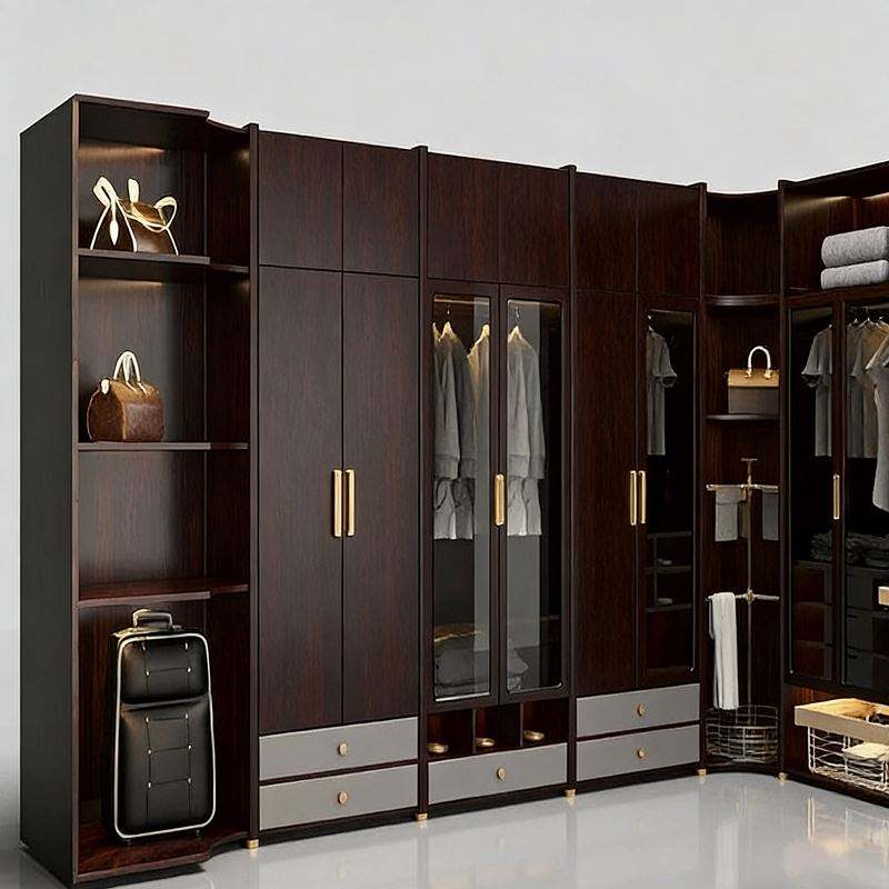 BALOM Dressing d'angle en L moderne de luxe sur mesure avec finition en bois foncé, portes en verre, quincaillerie dorée et design de rangement ouvert