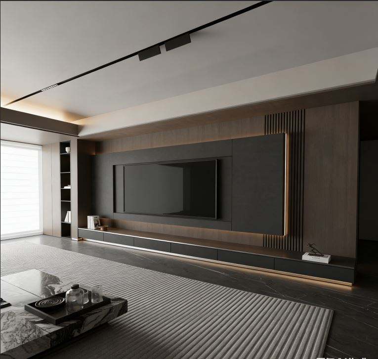 Meuble TV mural BALOM personnalisé, foncé, avec tiroirs de rangement et étagères latérales pour le salon