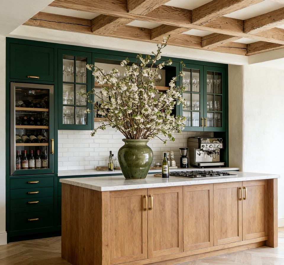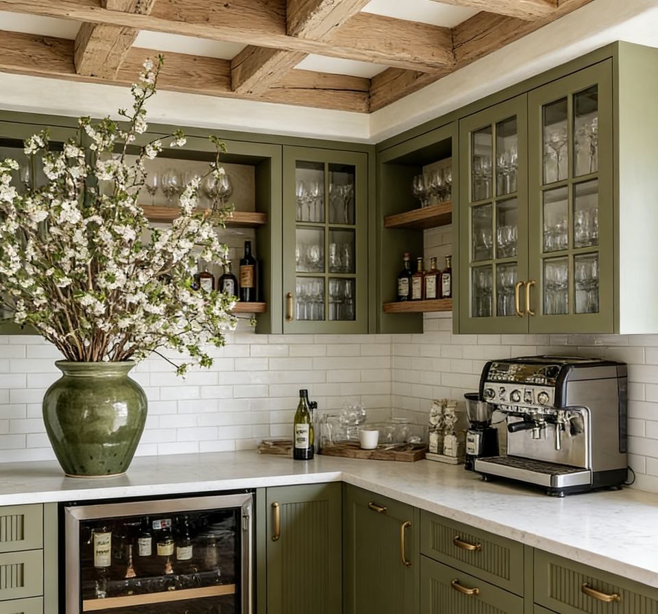 Meubles de cuisine BALOM personnalisés de style ferme, vert olive - Armoires élégantes avec portes nervurées et étagères de rangement ouvertes