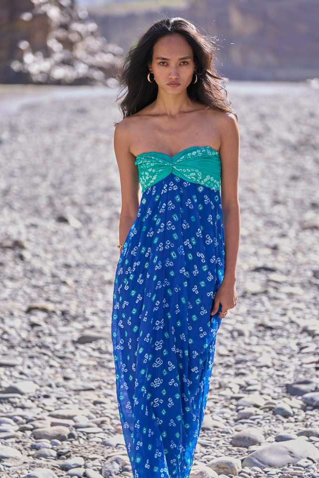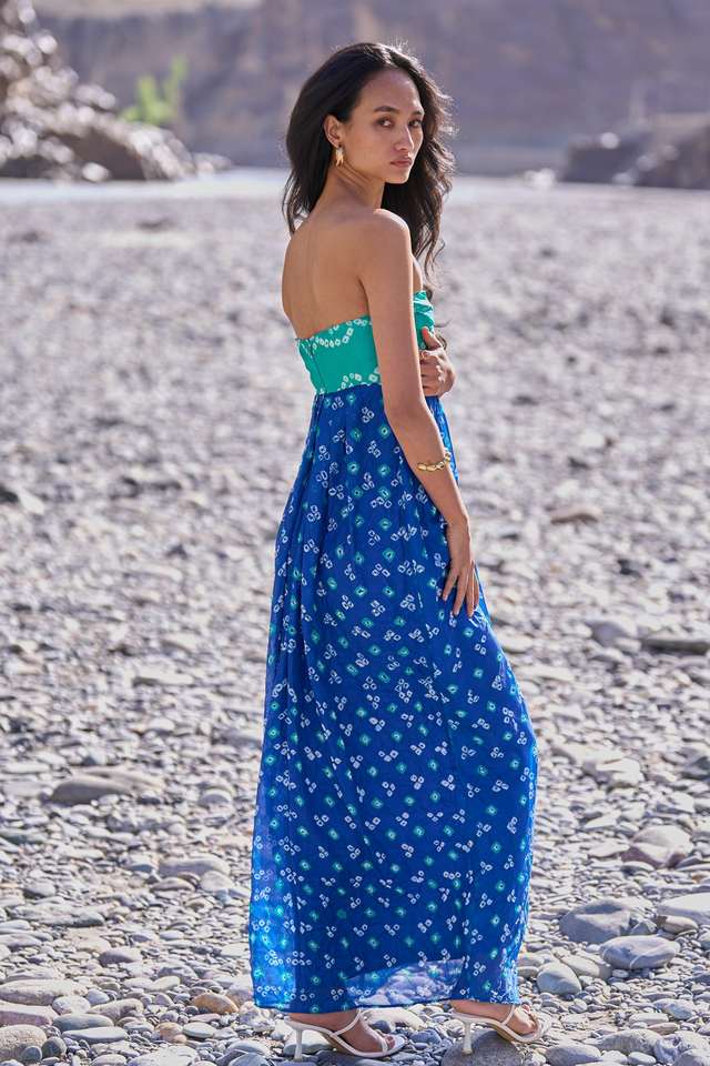 BANDHANI DRAPED DRESS Off-Shoulder Rich Shades Aqua Deep Blue Woven Eco-Friendly Washable Knot Detail Architectural Top Patterns