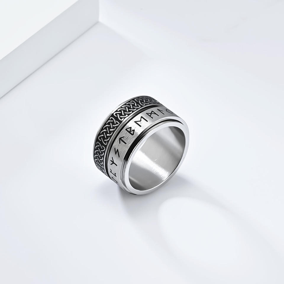 BASQUESUN Usine en gros personnalisé STOCK en acier inoxydable gravé texte Viking noeud celtique anneau rotatif
