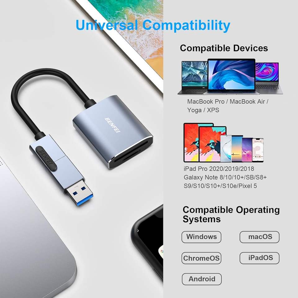 Lecteur de carte mémoire BENFEI, USB Type-C/Type-A vers lecteur de carte SD TF compatible avec iPhone 15 Pro/Max, Mac Book Pro/Air 2023