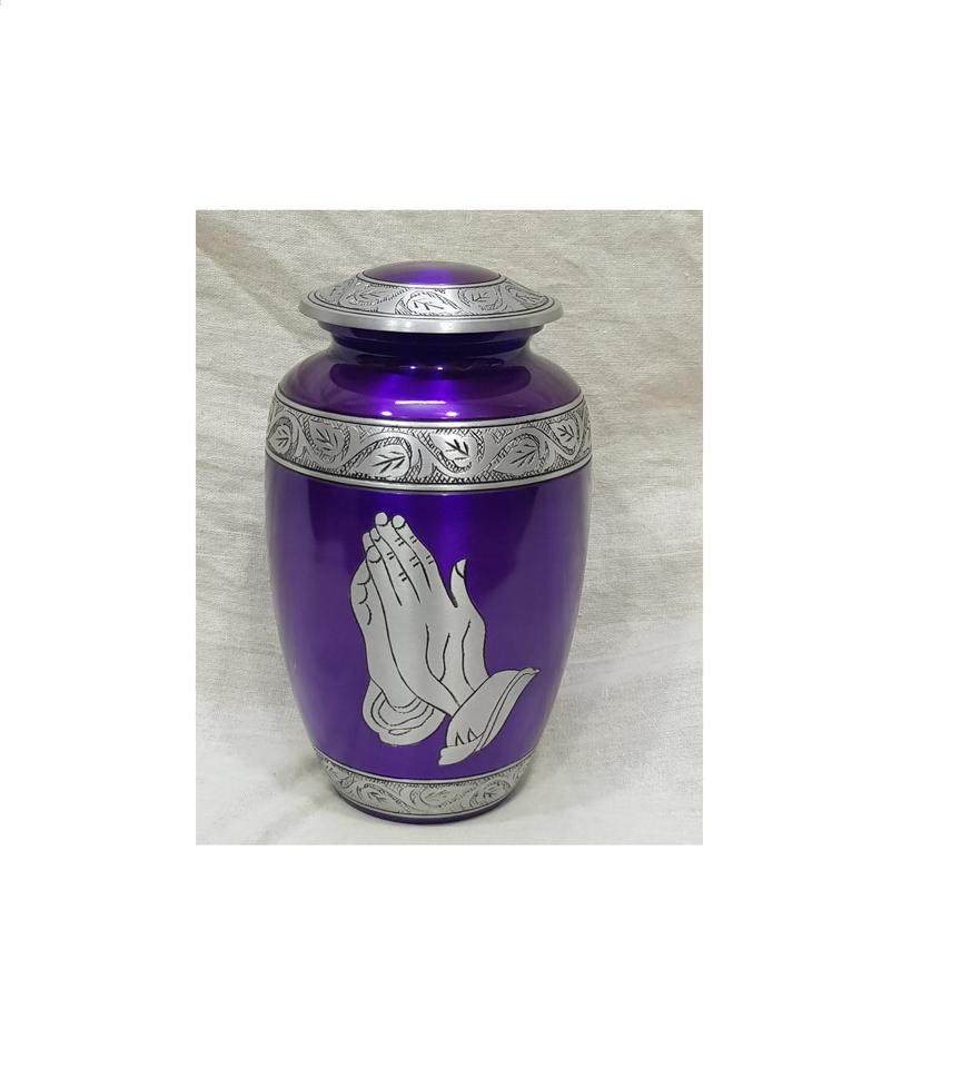 Urne funéraire pour adulte en aluminium bleu, gravée argentée, motif main de prière, style américain, Brassworld India
