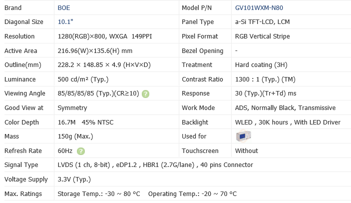 Module d'écran LCD TFT BOE 10,1 pouces 16:10 1280x800 avec rétroéclairage WLED, affichage HMI industriel pour l'automatisation des usines GV101WXM-N80