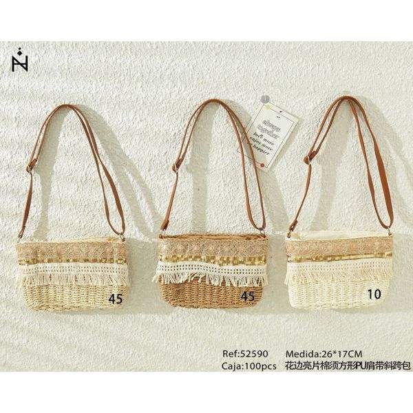 Sac bandoulière carré en PU avec franges en coton, dentelle et sequins, 26x17cm